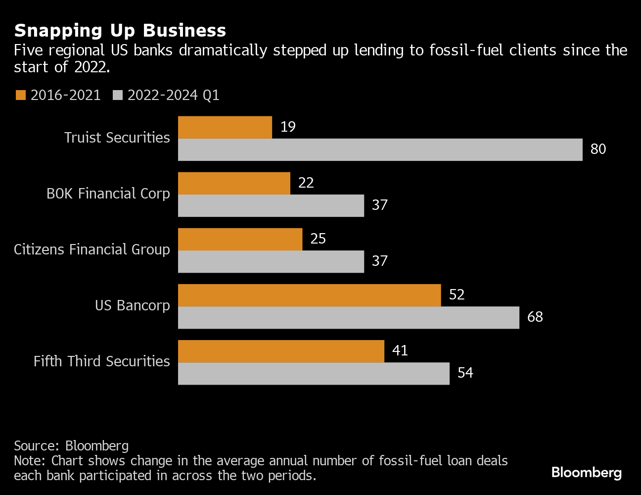 Since the start of 2022, the combined number of fossil-fuel loans provided by Citizens Financial, BOK Financial, Truist Securities, Fifth Third and US Bancorp rose more than 70% on an average annualized basis, compared with the preceding six years, the Bloomberg data show.