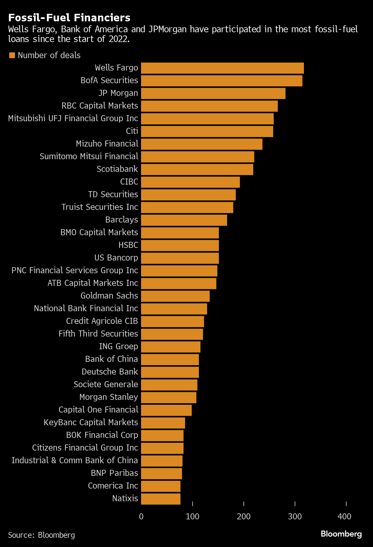 Wall Street’s largest banks, meanwhile, remain among the absolute biggest lenders to the fossil-fuel industry. Last year, such loans were dominated by Wells Fargo & Co., Bank of America Corp. and JPMorgan Chase & Co., according to Bloomberg data.