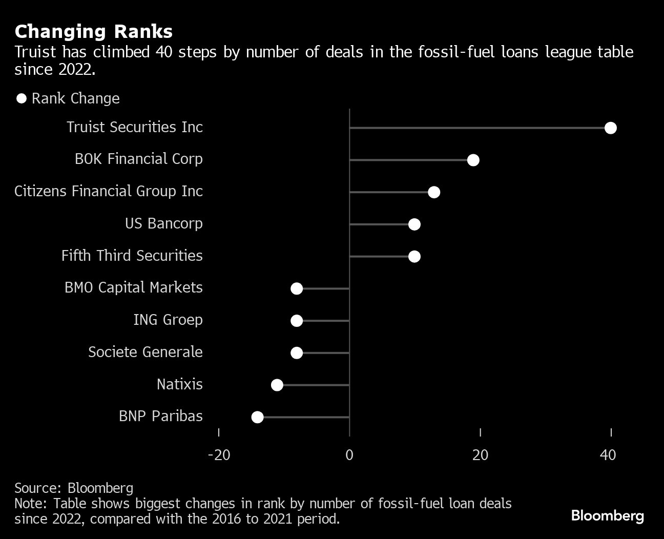 The list of banks includes Citizens Financial Group Inc., BOK Financial Corp. and Truist Securities Inc., according to data compiled by Bloomberg. The companies have climbed between 13 and 40 steps up the league table for fossil-fuel lenders since the end of 2021, placing them among the world’s top 35 banks by number of deals. Fifth Third Securities Inc. and US Bancorp, already in the top 30, both ascended 10 steps in the same period.