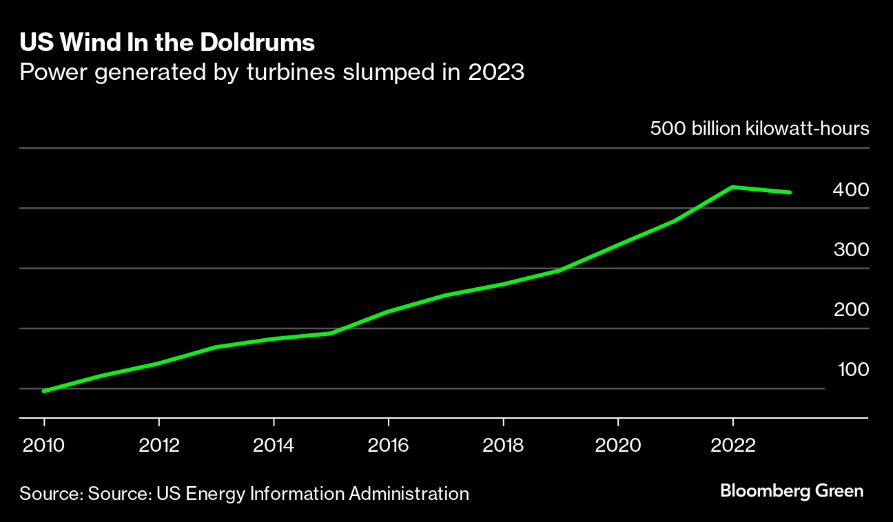 Power produced by turbines slipped 2% in 2023, even after developers added 6.2 gigawatts of new capacity, according to a government report Tuesday. The capacity factor for the country’s wind fleet — how much energy it’s actually generating versus its maximum possible output — declined to an eight-year low of 33.5%. Most of that decline was driven by the central US, a region densely dotted with turbines.