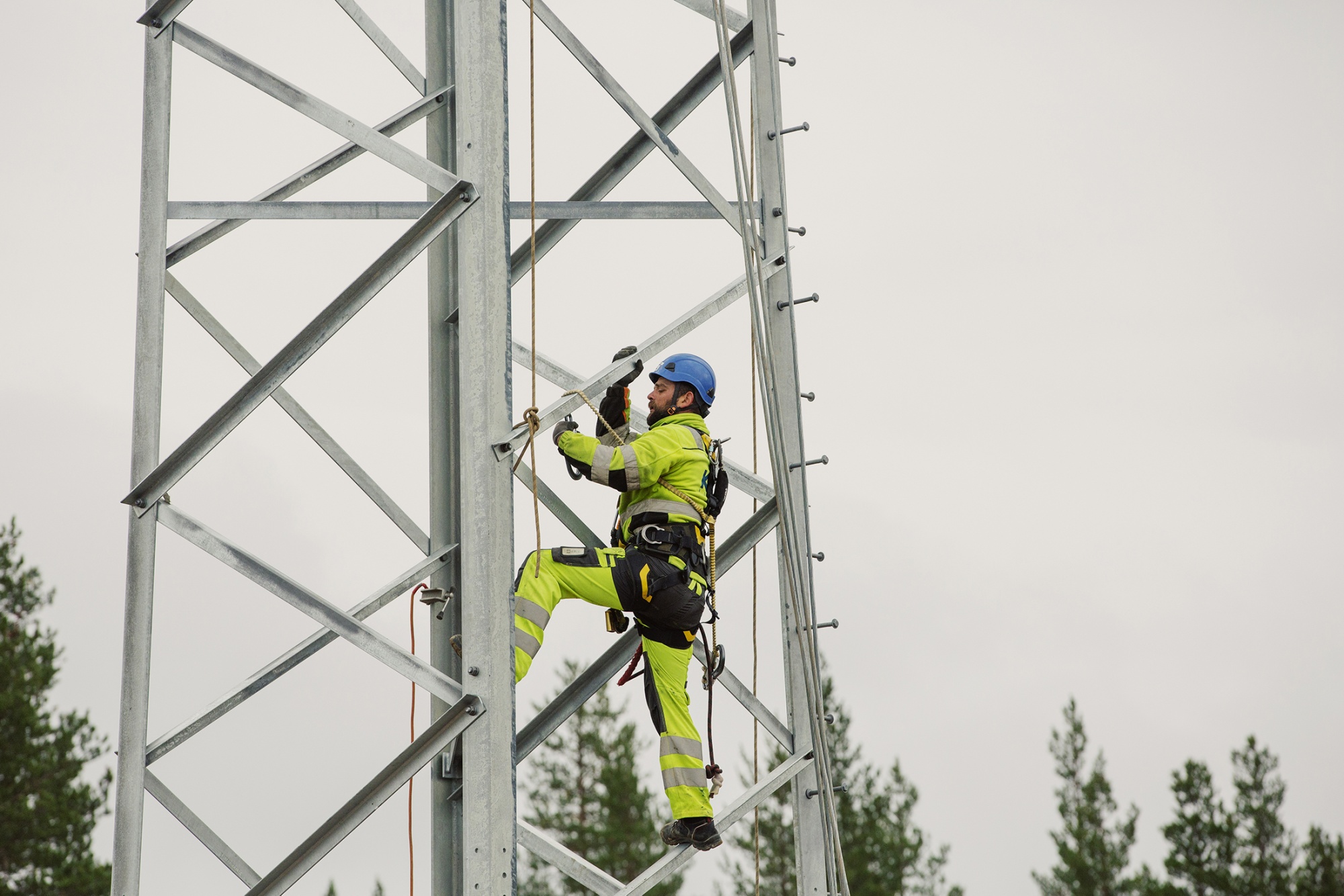 In a fresh clearing stretching 380 kilometers (236 miles) in Sweden and Finland, its workers are assembling a new 4 billion-krona ($390 million) electric highway called Aurora Line. On a late morning on Sept. 13, two workers climbed 25 meters up in the air to attach a long beam across a steel tower that will hold up power lines.