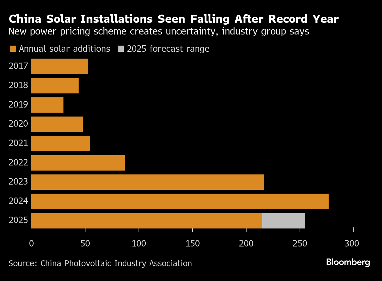 (Bloomberg) -- China’s solar industry expects installations to drop in 2025 after an unprecedented surge in additions last year left power grids racing to keep up.