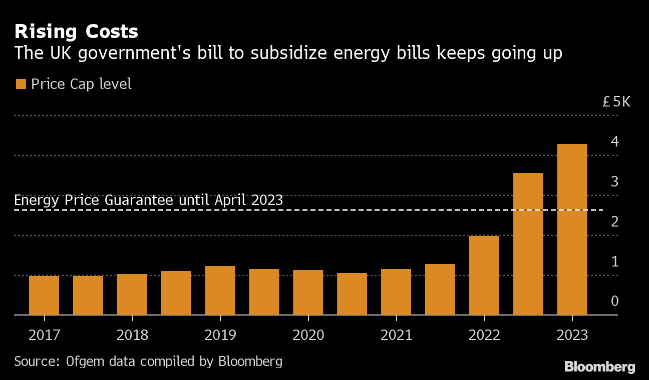 The UK has been subsidizing Ofgem’s price cap since October in an attempt to shield households from the worst energy crisis in decades. That means a total of around £16 billion in the first three months of 2023 to keep tariffs at £2,500, according to analysis from the Resolution Foundation think tank.