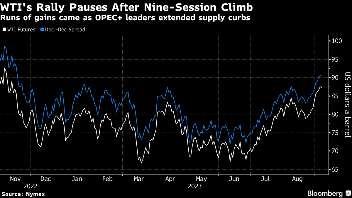 West Texas Intermediate fell toward $87 a barrel after posting nine straight daily gains, the longest stretch of advances since January 2019. That surge, which propelled futures into overbought territory, came as Saudi Arabia and Russia pledged to prolong their export curbs through the fourth quarter.