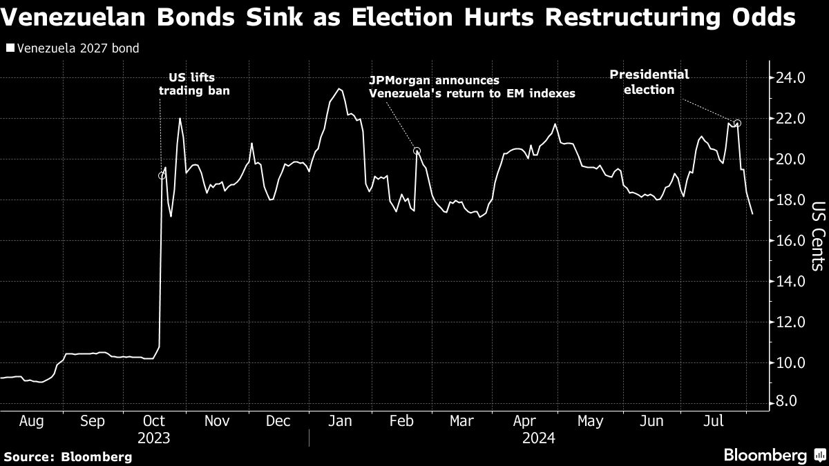 Money managers had warmed to the idea of negotiating with Maduro ahead of the vote, assuming he’d gain US recognition from a fair election. The government recently hired Rothschild & Co. to map out its roughly $150 billion of defaulted debt, which includes overseas bonds and other obligations, like bilateral loans.