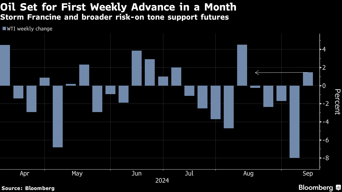 (Bloomberg) -- Oil slipped after producers started bringing output back online after Storm Francine passed, though futures still headed for their first weekly gain in a month as the disruptions and risk-on sentiment in wider markets helped ease a previously oversold crude market.
