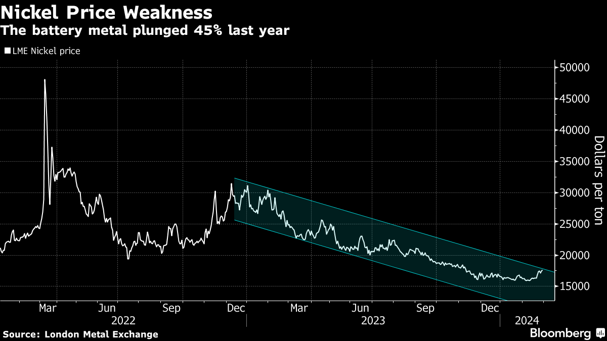 (Bloomberg) -- Indonesia, the world’s largest nickel exporter, has a sobering message for struggling producers of the battery metal elsewhere: don’t expect any meaningful revival in prices.