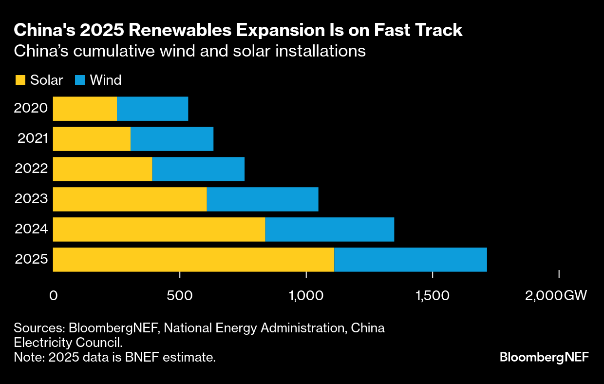 China’s wind and solar capacity more than doubled from 2020 to 2024 to 1,350 gigawatts, a level that exceeds all of the power plants in the US, according to BloombergNEF.