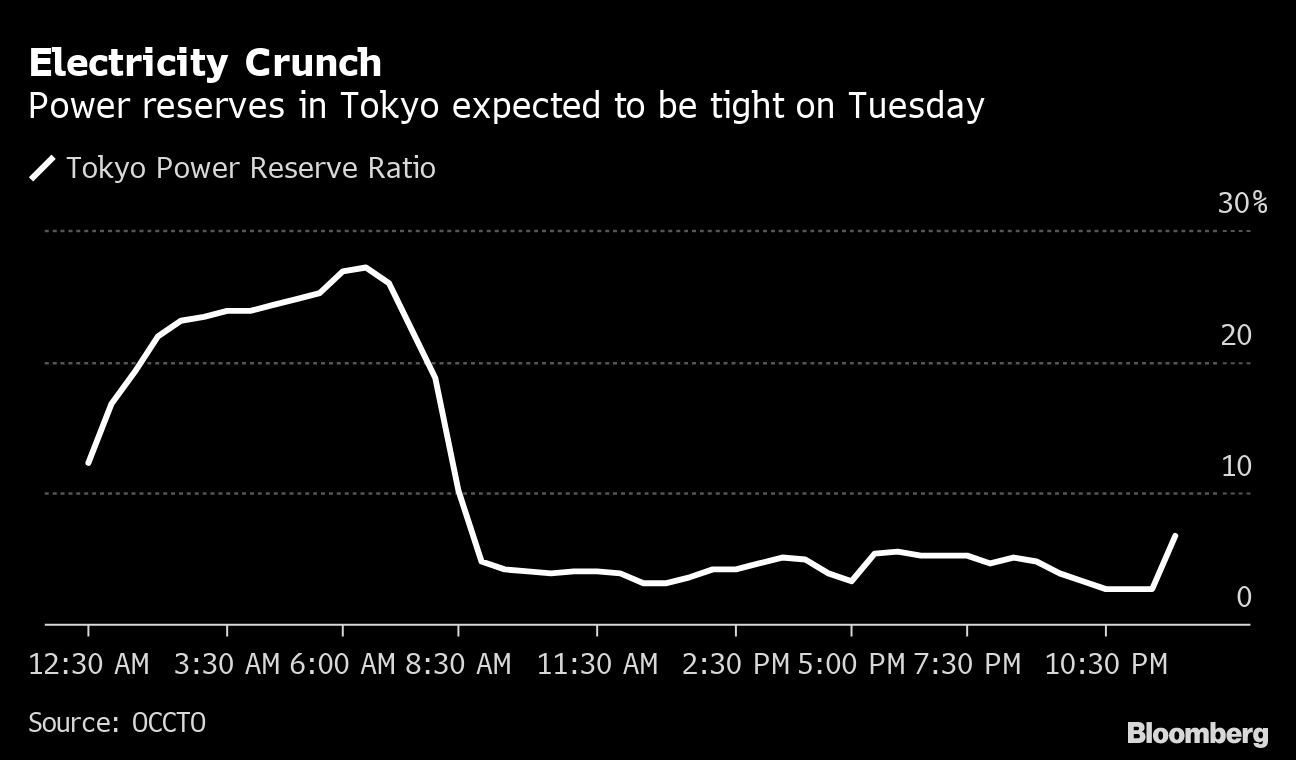Read more: Japan Power Crisis Was a Decade in Making and Won’t Go Away Japan in March issued a power supply warning, the first of its kind, after supply neared critical levels in Tokyo and has since introduced a new system to warn people to prepare for potential crunches. Under the new methodology, the government will issue a supply advisory a day before if reserve ratios are expected to drop below 5% and will ramp it up to an alert if that figure is seen slipping under 3%, the minimum level necessary for a stable grid.
