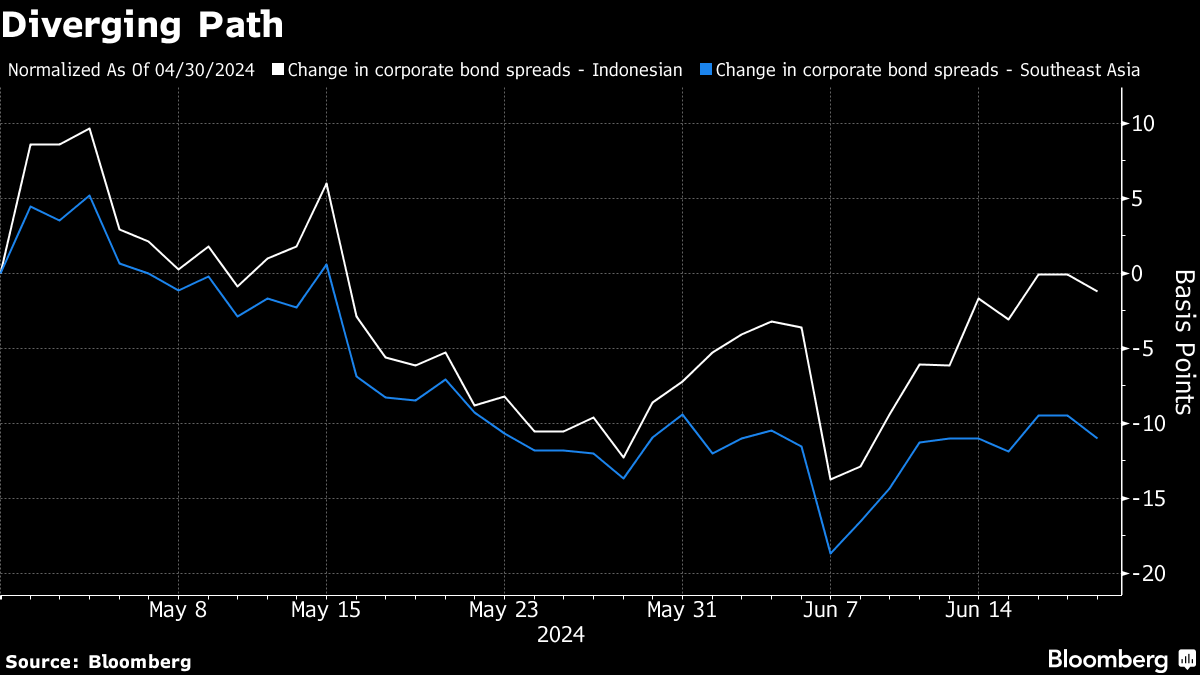 The average spreads of corporate and quasi-sovereign notes have widened six basis points in June, the most in five months, as Bloomberg News reported that President-elect Prabowo Subianto plans to raise the country’s debt ratio to fund his spending promises. On Friday, the rupiah hit a new four-year low, making it costlier for local companies to service their dollar debts.