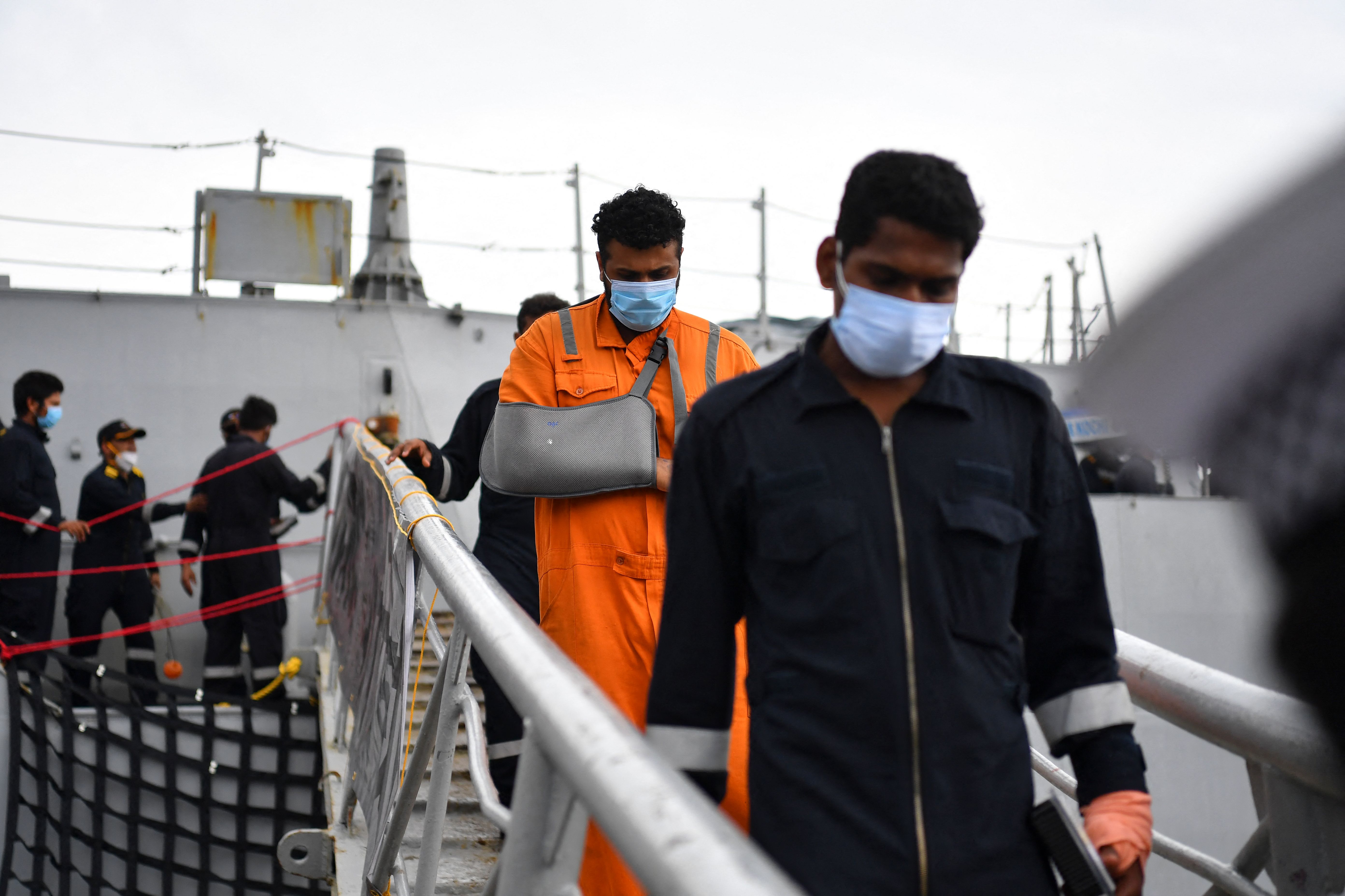 Rescued crew members from the Papaa 305 disembark the INS Kochi naval ship after arriving in Mumbai on May 19.