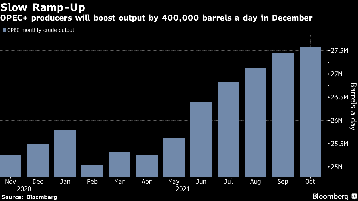 Futures in New York traded above $79 a barrel, though prices have shed about 5% this week. After a brief meeting, OPEC and its allies agreed to boost output by 400,000 barrels a day in December, maintaining its modest pace of monthly increases. The White House is considering a range of tools to deal with prices, the National Security Council said after the OPEC+ decision.