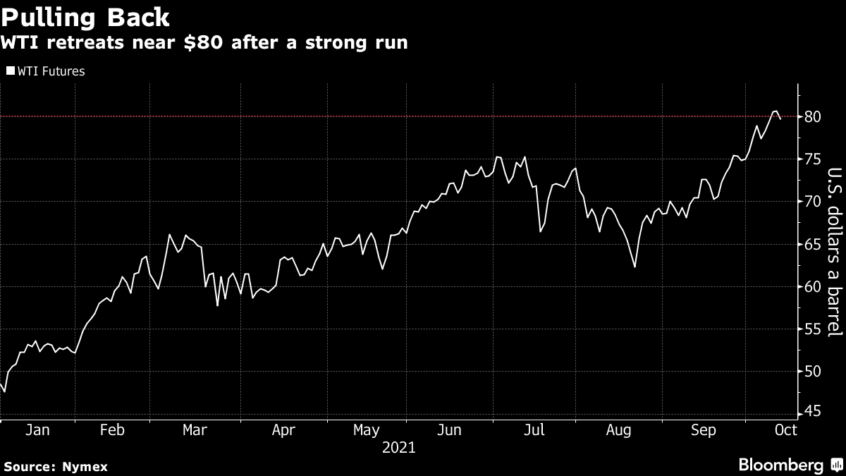 Futures in New York fell as much as 1.5% on Wednesday, after rallying for four straight sessions. OPEC revised down its estimate for 2021 global oil consumption in its monthly market report. The group said that while the spike in natural gas prices could boost petroleum use in some areas, such as power generation, it could potentially curb demand in other areas, such as refining. Meanwhile, U.S. consumer prices rose in September by more than forecast, underscoring the persistence of inflationary pressures on the economy.