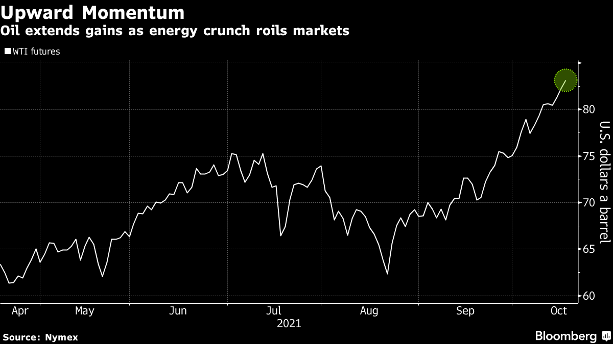 Futures in New York were above $83 a barrel after adding 3.7% last week, capping the longest run of weekly gains since 2015. A shortage of natural gas is creating extra demand for oil products like fuel oil and diesel from the power generation sector. That’s coincided with key economies rebounding from the pandemic.
