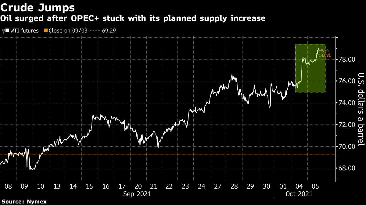 Futures in New York advanced as much as 2% on Tuesday, heading closer to the key, psychological $80-a-barrel level. At an OPEC+ meeting on Monday, Saudi Arabia and its partners opted for only a modest output increase of 400,000 barrels a day for November, taking many analysts by surprise as a spike in natural gas prices looks set to inflame demand for oil products this winter.