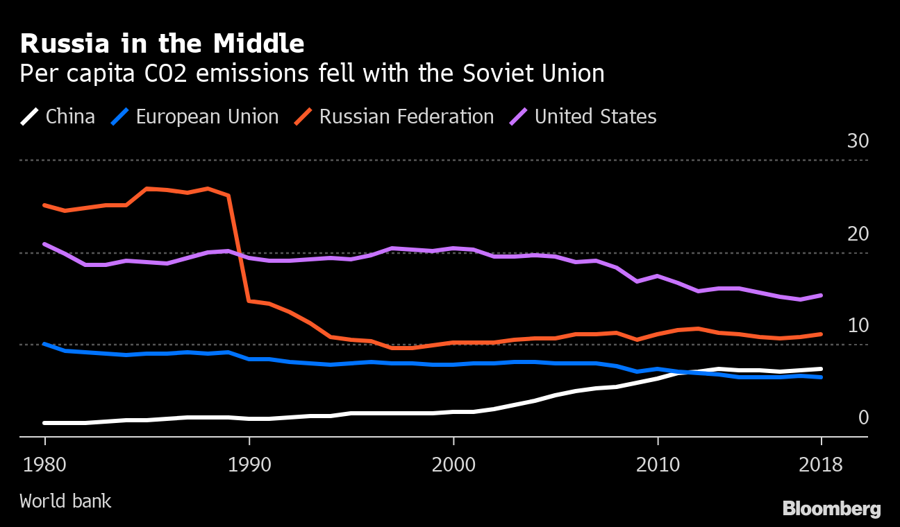 The truth may lie between. In terms of per capita CO2 emissions, Russia substantially underperforms the EU and China, but beats the U.S., according to World Bank data from 2018, the latest available.
