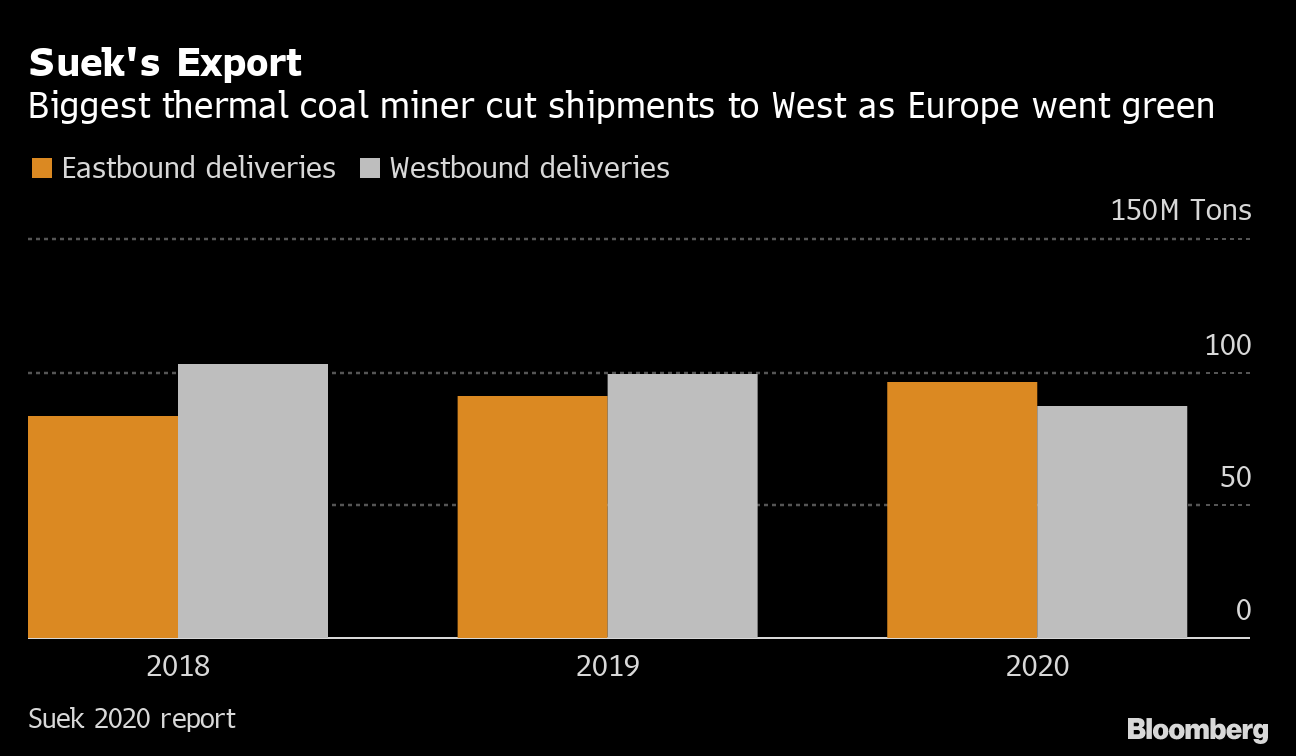 There are fewer transport bottlenecks to the west, with about 35% to 45% of thermal coal supply typically exported through the northern and southern ports, including to Europe, according to the data from companies. The infrastructure can handle about 133 million tons of coal toward the west this year, said Kirill Nikoda, deputy head of the center for economic forecasting an Gazprombank. That’s almost 40 million tons higher than capacity in 2020, following several expansion projects, he said.