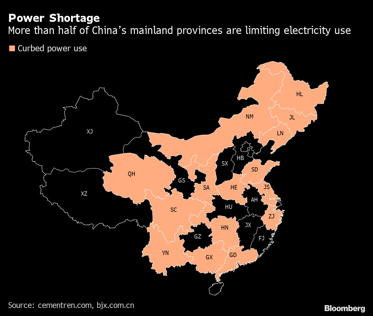 At least 20 Chinese provinces and regions making up more than 66% of the country’s gross domestic product have announced some form of power cuts, mostly targeted at heavy industrial users. The reasons are two-fold -- record high coal prices are causing power generators to trim output despite soaring demand, while some areas have pro-actively halted electricity flows to meet emissions and energy intensity goals.