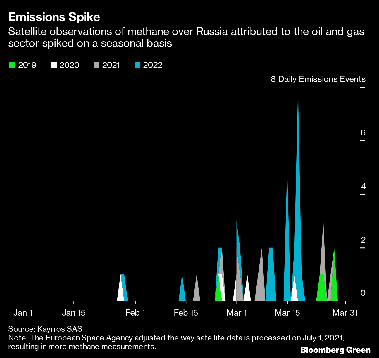 There’s been intense focus on the flow of gas from Russia to Europe as politicians vow to reduce the continent’s reliance on fossil fuels from President Vladimir Putin’s regime. But the emissions spotted by Kayrros don’t appear to be related to a change in deliveries, which remained stable in March, according to Gazprom data.While the number of emissions events were unusually high to be spotted in just a matter of days, Kayrros cautioned that there could be other explanations for the jump. The European Space Agency last July changed how it filters cloudy pixels, which has boosted the number of methane observations in its data. Clearer-than-normal weather could have also made more methane plumes visible.