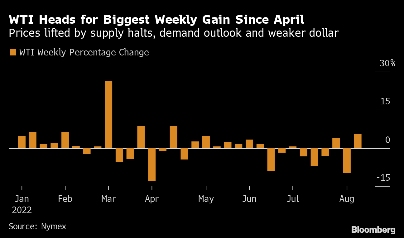 Oil Racks Up the Biggest Weekly Gain Since April on Supply Halts