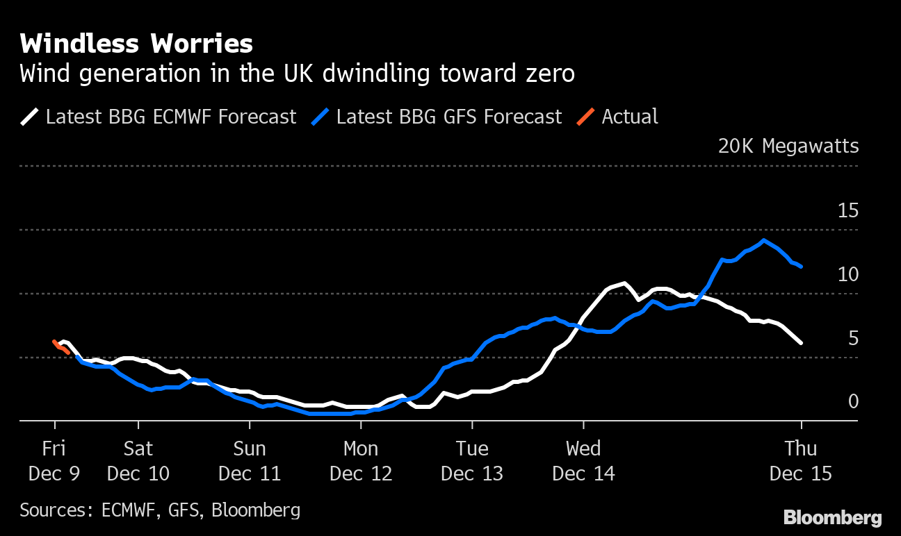 There are also other weather threats to Europe’s energy system. Wind output will reach a low over the weekend in the UK before increasing on Monday — something that caused short-term power prices to rally.