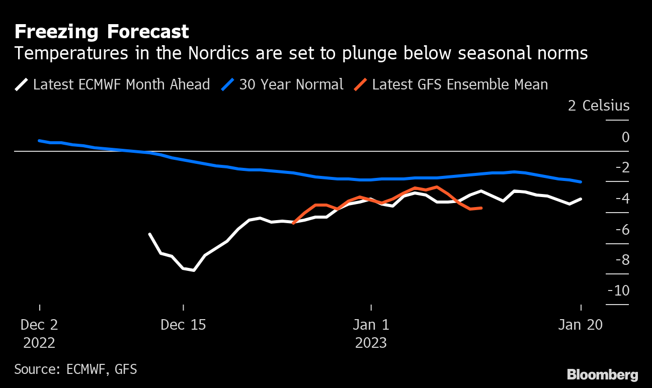 The worry is that the biting conditions are accompanying a worsening power crisis in Sweden, with an outage at the country’s biggest nuclear reactor raising the real risk of disconnections. That means the nation will have to rely on power imports from Norway, Germany and Poland to ensure there’s enough to go around.