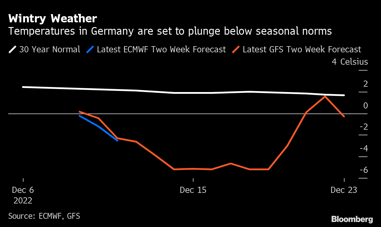 Curbing consumption is essential for Germany to last the winter without rationing or blackouts, though the government so far expects to have enough energy. A mild autumn helped limit demand and to fill up gas-storage sites, easing supply worries. But that could start to change if temperatures plunge for a sustained period.