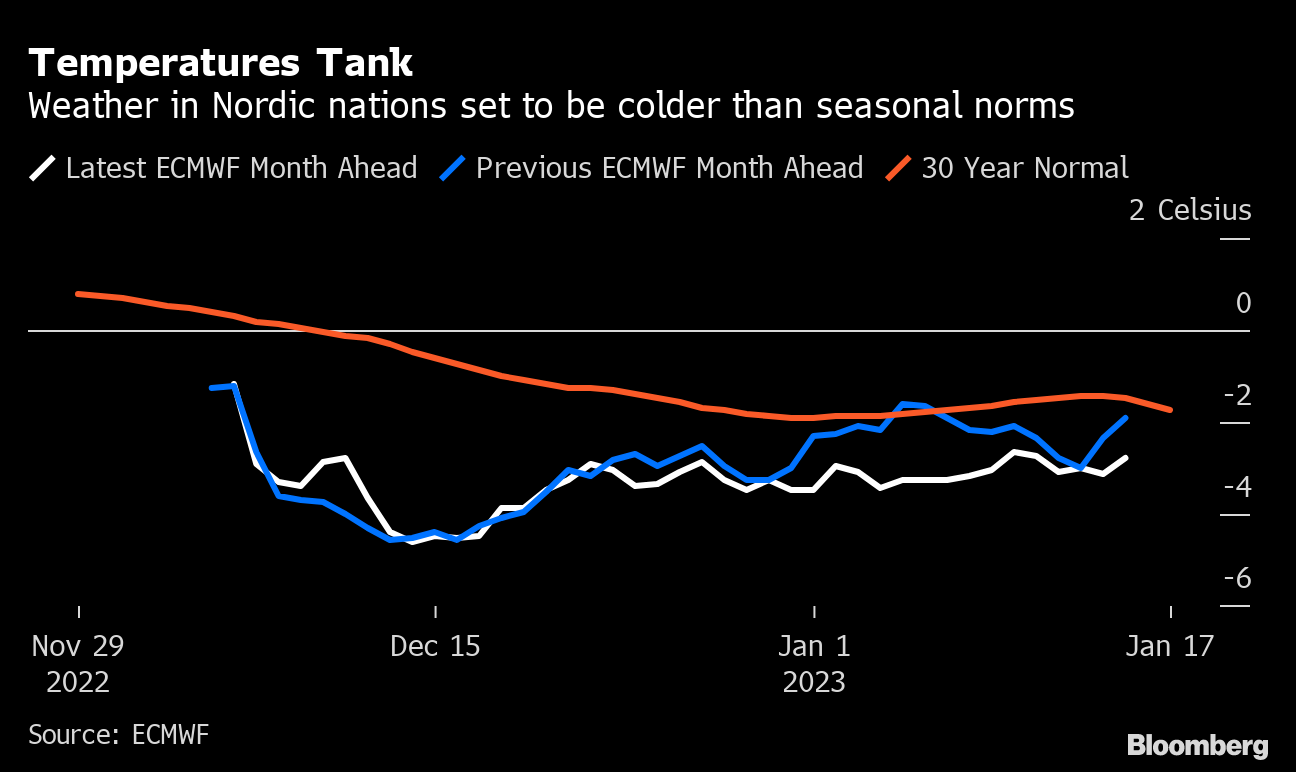 Nordic countries will feel the brunt of the cold snap, with a low of -9.5C (14.9F) in Oslo expected next Tuesday, forecaster Maxar Technologies Inc. said in a report. Arctic air will also sweep across the UK and Germany, with temperatures in London sinking to 7.7C below the seasonal average on Monday.