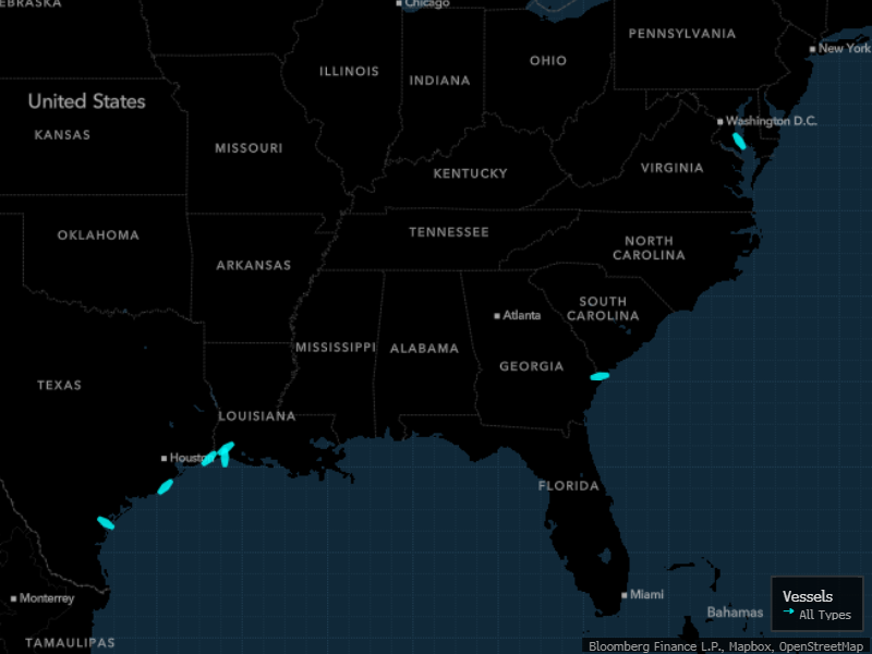 (Bloomberg) -- Tankers were docked or loading at all seven U.S. liquefied natural gas export terminals for the first time Saturday, marking a small piece of industry history and setting up record flows to the plants amid high prices and tensions in Europe.