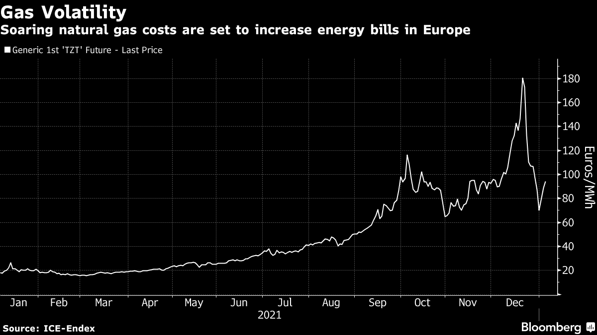 (Bloomberg) -- Households in Europe are set to pay an average of 54% more for energy than they did two years ago, due to soaring natural gas and power prices across the region, according to Bank of America Corp.