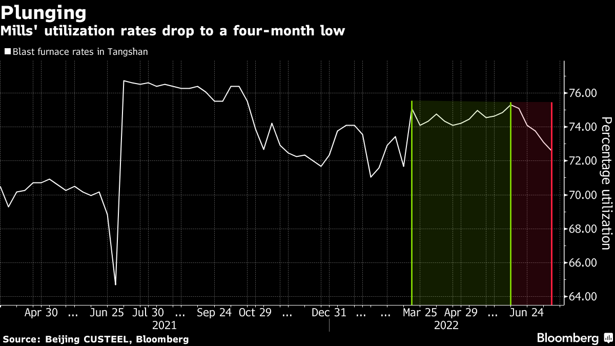 Blast furnace utilization rates in China’s steel hub of Tangshan have fallen to the lowest in four months. The steep slide comes amid warnings that output cuts are necessary to tackle pinched profit margins. Mills have built up stockpiles that have struggled to find takers as businesses were disrupted by lockdowns. The industry also needs to contend with the recent wave of consumer mortgage boycotts that are threatening demand prospects.