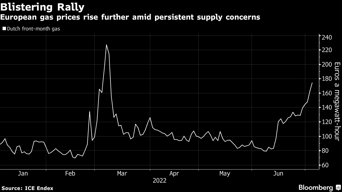 Dutch front-month gas futures, the European benchmark, traded 1% higher at 164.50 euros per megawatt-hour by 4:39 p.m. in Amsterdam. The UK equivalent rose 2%, also paring its advance. German year-ahead power slipped, after earlier trading near record levels.