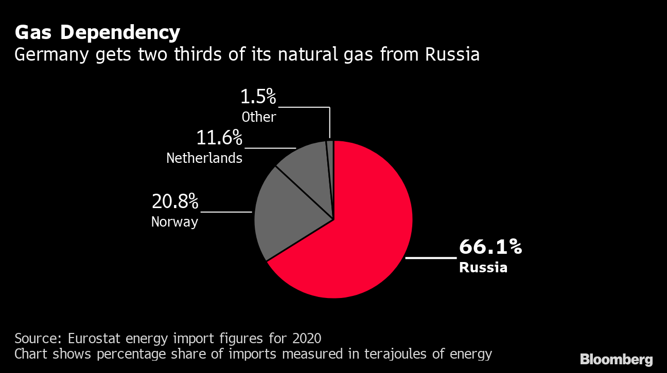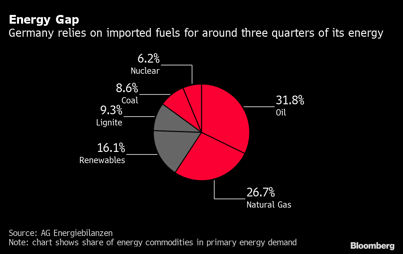 (Bloomberg) -- For years, the U.S. warned Germany of building up a dangerous energy dependence on Russia, the source of more than half of its fossil fuel imports. Now that the war in Ukraine has shocked Berlin into the same conclusion, the government is finding that changing course might be too late.