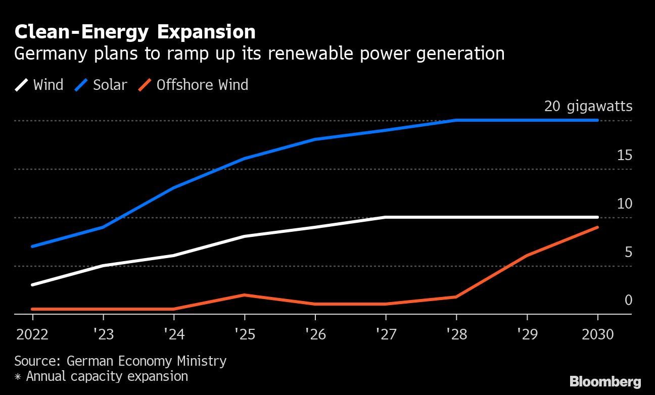 Insurers Euler Hermes and Allianz SE estimate that it would require 170 billion euros in investment a year for the European Union to gain independence from Russian energy. Habeck, a former co-leader of the Green party, proposed legislation this week that would roughly triple the pace of adding wind and solar power.