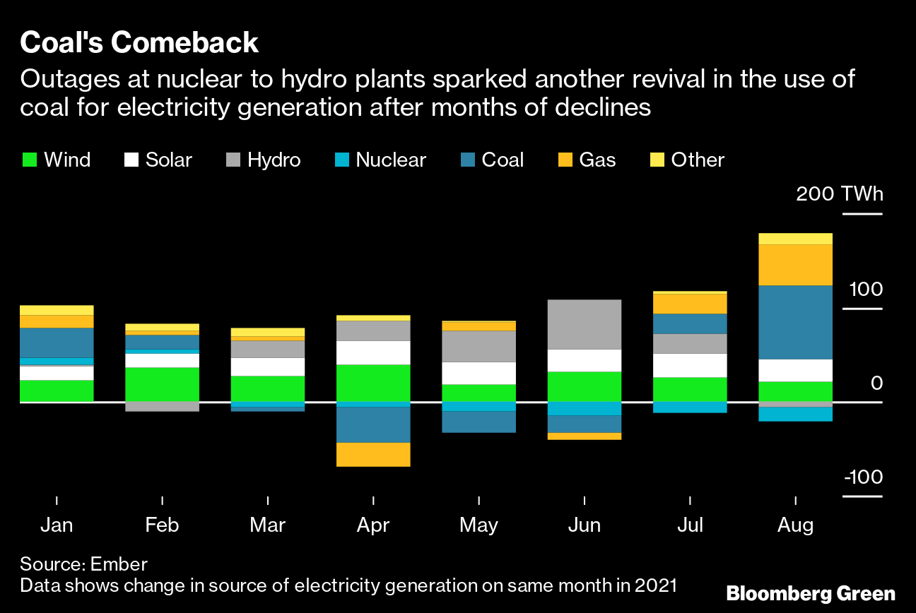 Things haven’t gotten much better this year. Coal power generation rose about 1% over the previous year through August, according to data from Ember. In Europe, it’s been needed to replace Russian gas to help overcome lower output from nuclear and hydropower. In China, a historic drought in July and August sapped reservoirs of its massive dams, requiring a surge in coal consumption to fill the void. In the US, coal power plant retirements are being delayed and production of the fuel will increase 3.5% this year as miners seek to meet surging demand from around the world and take advantage of record prices.
