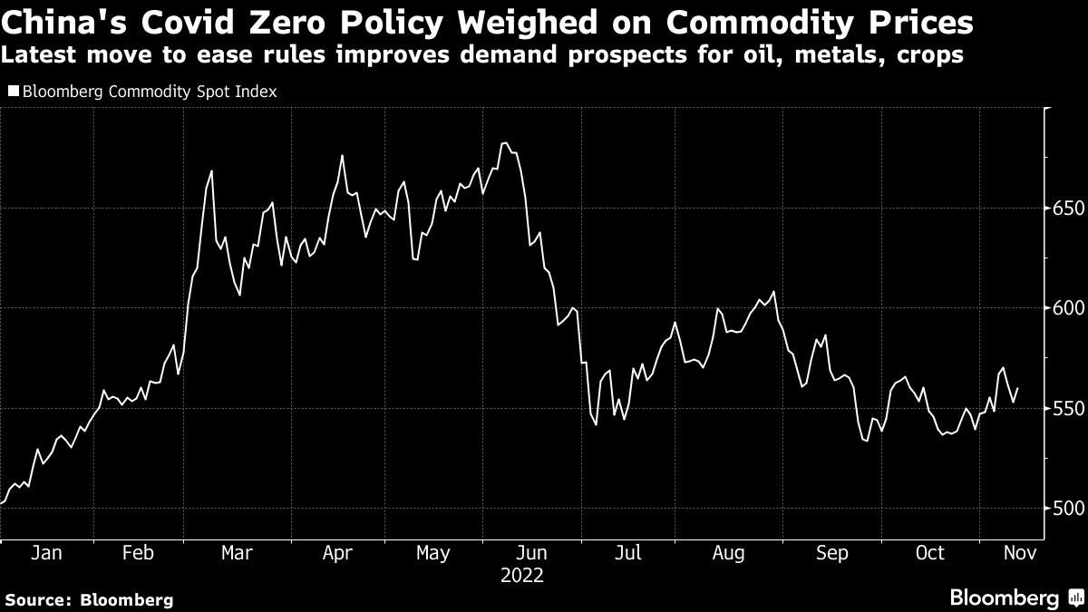 (Bloomberg) -- Commodities from oil to iron ore and copper jumped after China eased some Covid restrictions, raising hopes over a demand recovery in the world’s second-biggest economy.