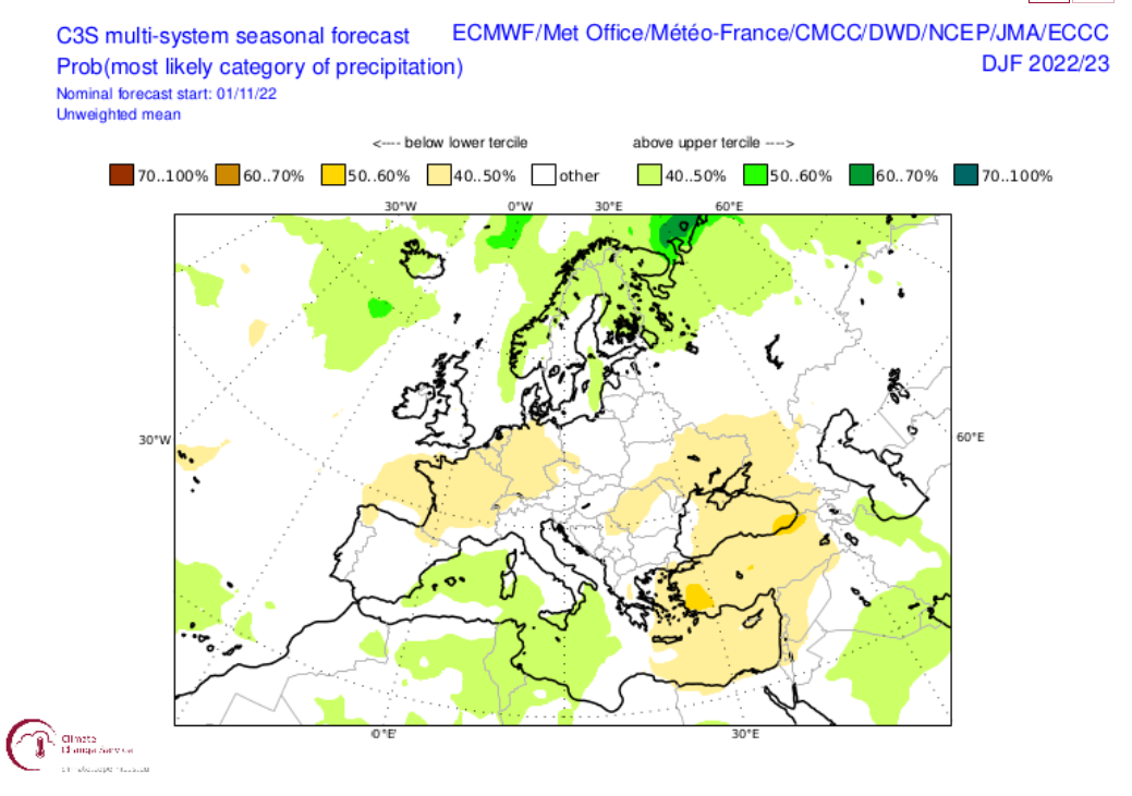 Much of France and Germany also have a 40% to 50% probability of experiencing well-below average precipitation over the next three months. Lack of rain and snowfall could impact inland river transport and hydropower operators, as well as affect the ski season.