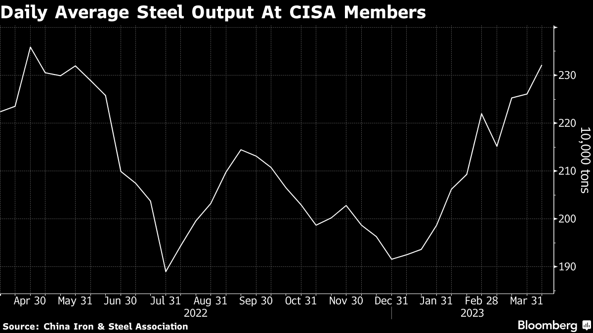 (Bloomberg) -- China’s energy and commodities output roared ahead in March as producers rushed to feed a revival in economic activity.