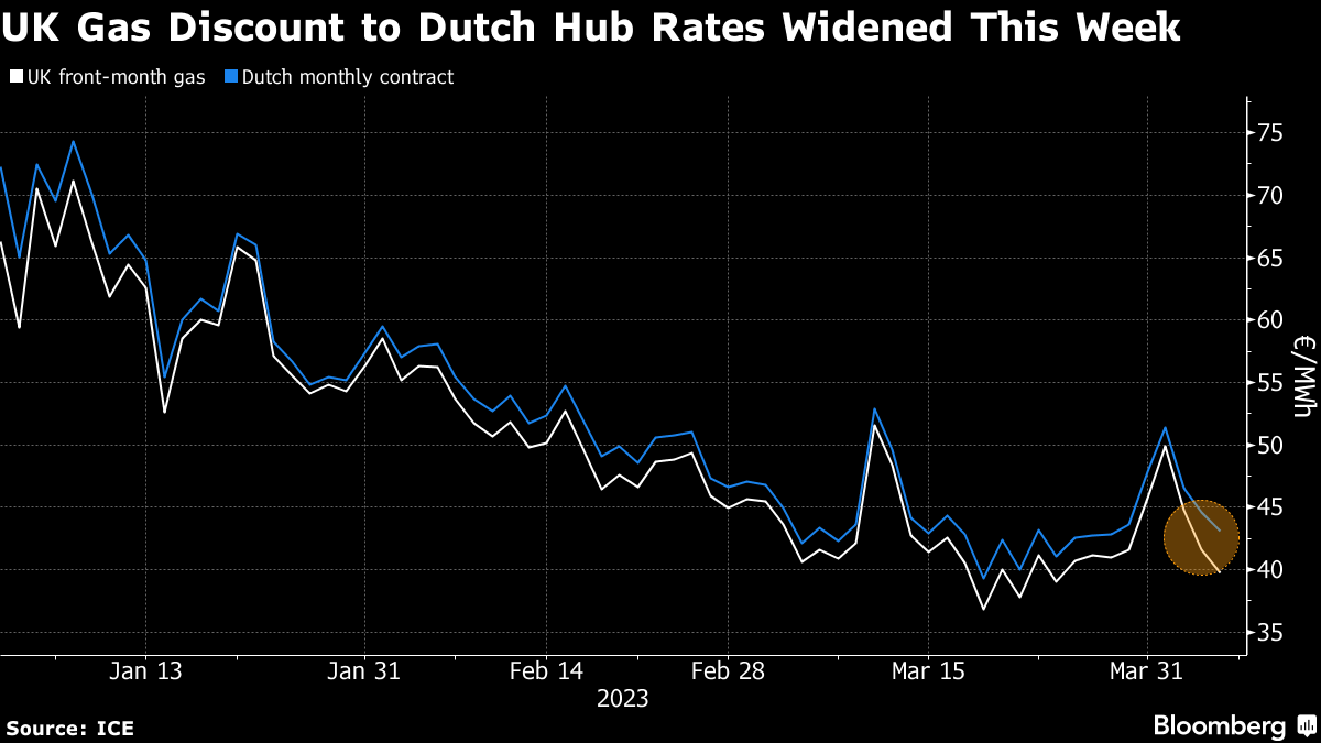 Dutch front-month futures posted a weekly loss of almost 10%, with trading shortened by the Easter holidays. The UK equivalent also slumped, widening its discount to the continental Europe hub.