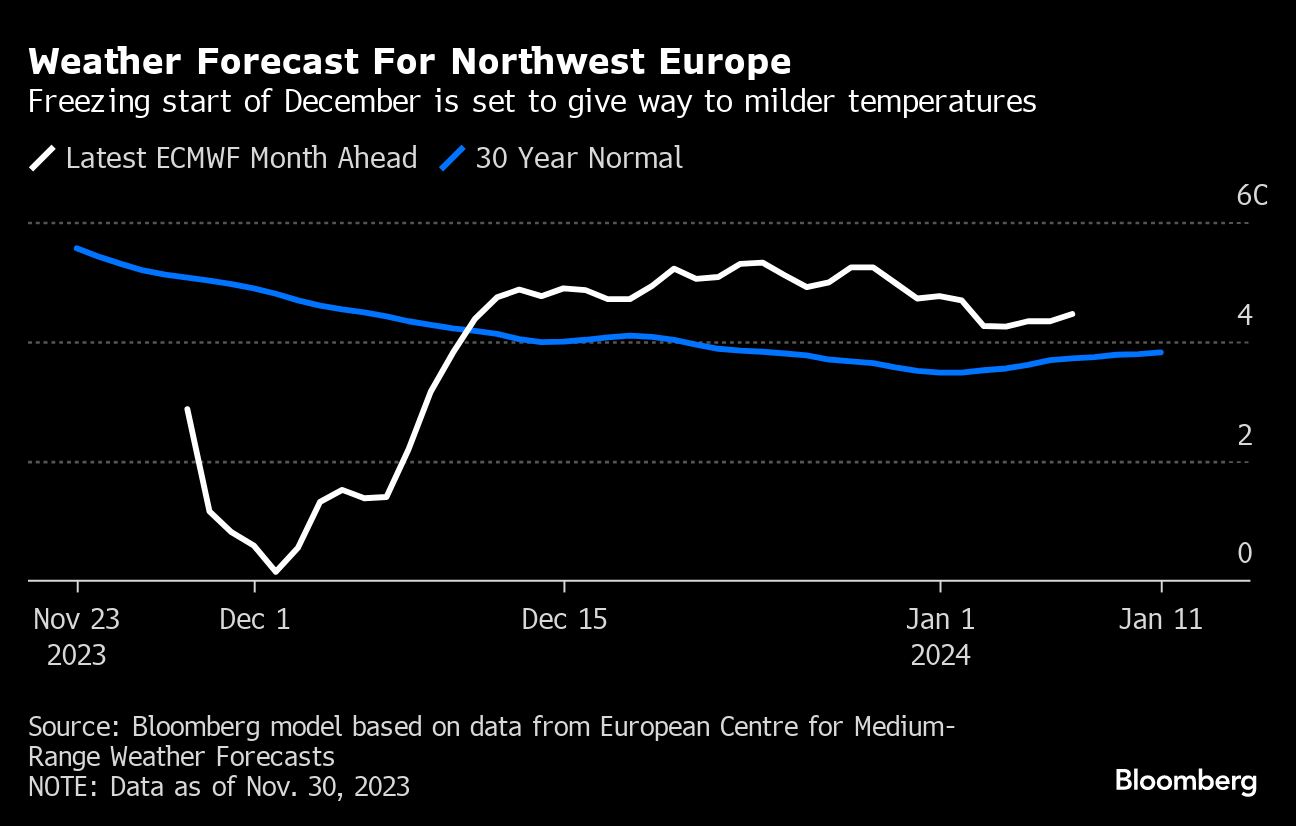 The outlook for a mild December comes after an unusually warm autumn delayed the start of Europe’s heating season, preserving stockpiled gas. Climate change has made 2023 the hottest year on record, with intensifying heat waves triggering wildfires, storms and flooding.