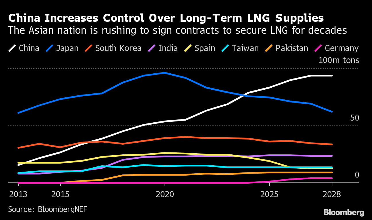 (Bloomberg) -- A rush by China to sign new long-term liquefied natural gas deals promises to give the nation even more control over the global market at a time when competition for cargoes is booming.