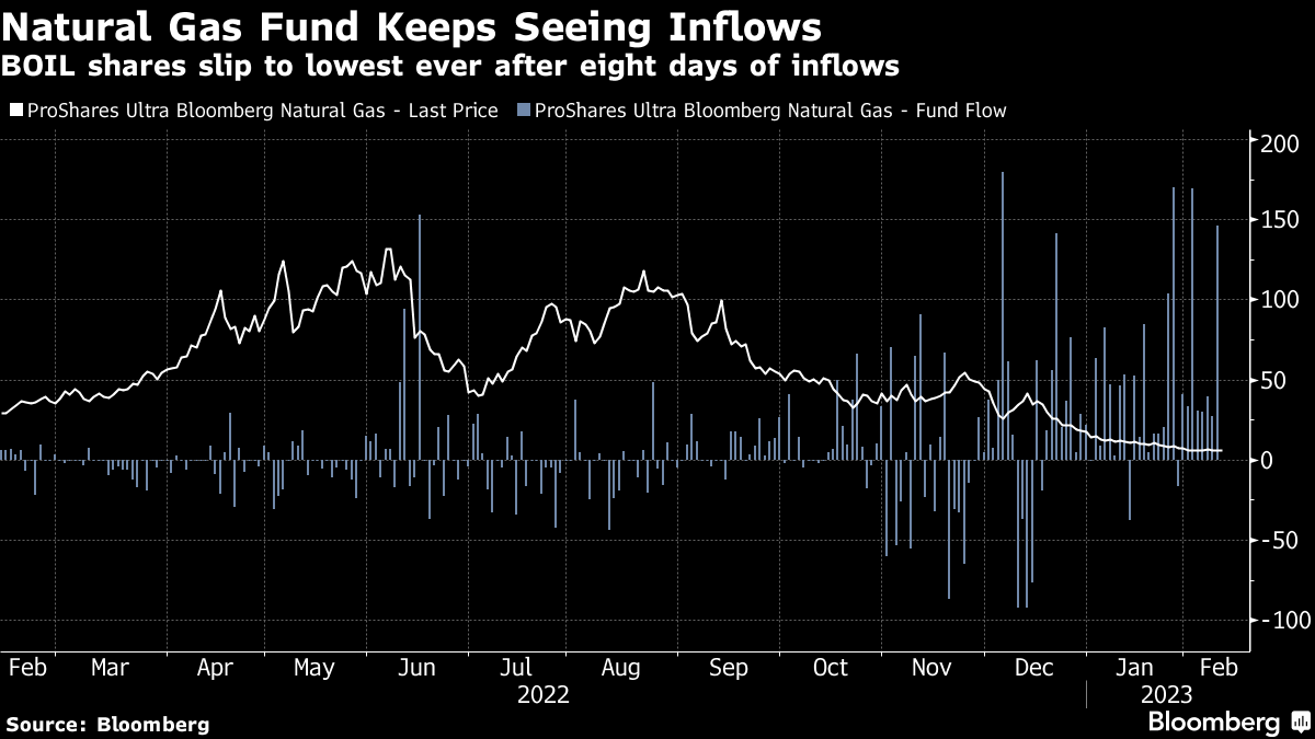 The $1.1 billion ProShares Ultra Bloomberg Natural Gas (ticker BOIL) saw $146 million in inflows in the latest session, which increased the fund’s assets by 15% to its highest level in at least a year, according to data compiled by Bloomberg. The fund has seen eight straight days of inflows, amounting to $517.8 million, even though its price is hovering at its record low.
