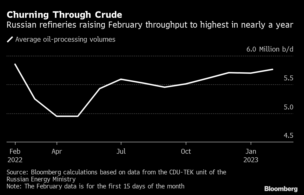 Russian refineries have slightly raised crude-processing rates so far this month, signaling that the European import ban and western price caps have yet to significantly impact the nation’s industry.