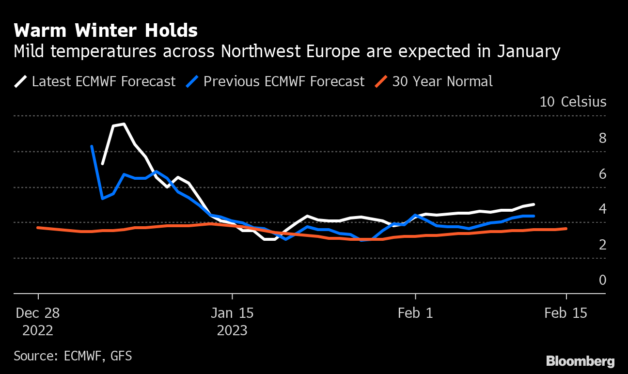 Mild conditions are likely to persist across the region until the end of the month, with a strong weather front blocking out cold polar air, according to forecaster Maxar Technologies Inc. While sparking climate concerns, the warmth over the past couple of weeks has been a boon for nations as they struggle against a crushing cost of living crisis that has seen household energy bills and inflation surge.
