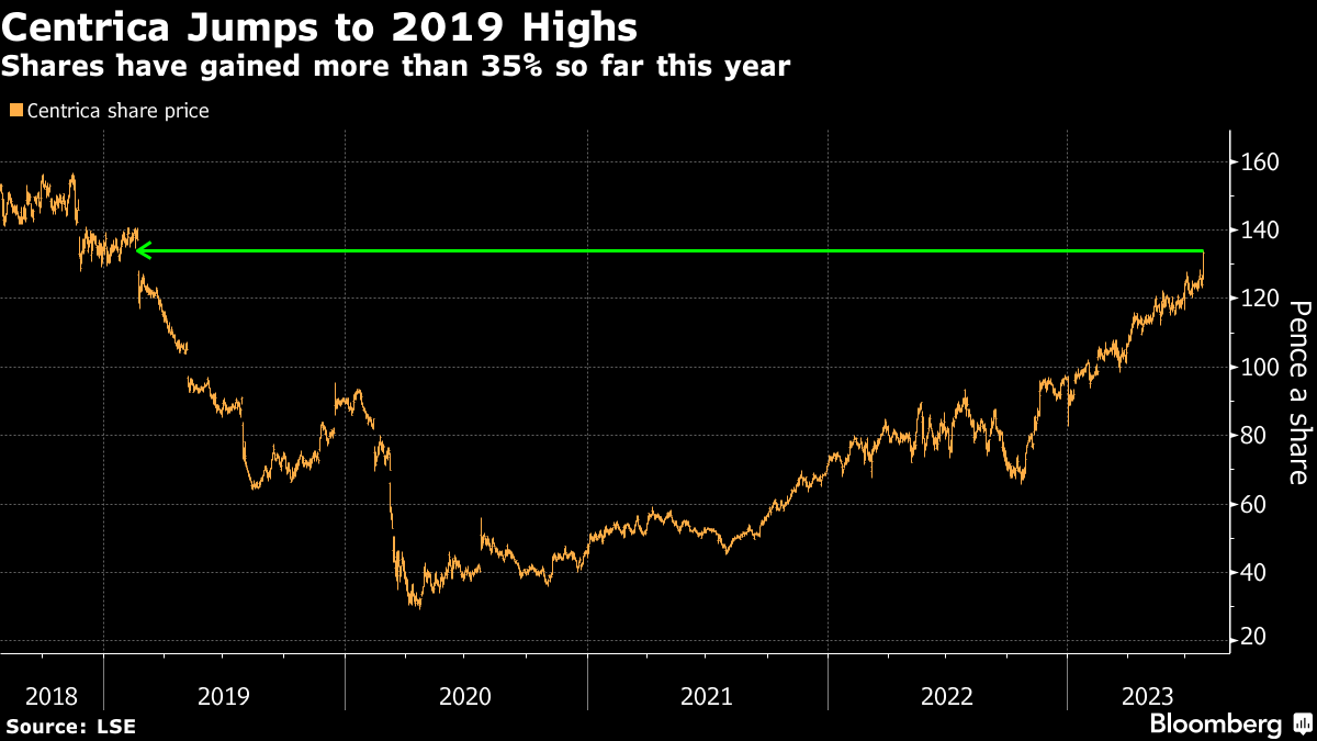 British Gas, the nation’s biggest household energy supplier, boosted adjusted operating profit nearly 10-fold year-on-year to £969 million. That’s the highest-ever first-half result for the unit and more than Centrica received from global energy trading. The company said last month it expected retail profits to be “significantly higher,” and consumer bills are forecast to stay elevated well into 2024.