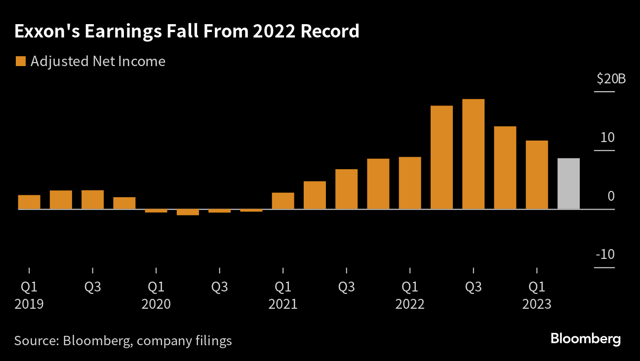 Net income dropped to $7.9 billion, less than half the level of a year earlier when Russia’s invasion of Ukraine upended global commodity supplies and trading. Exxon followed Shell Plc and TotalEnergies SE in missing estimates as the impact of lower gas prices and poor oil-refining margins rippled across the sector.