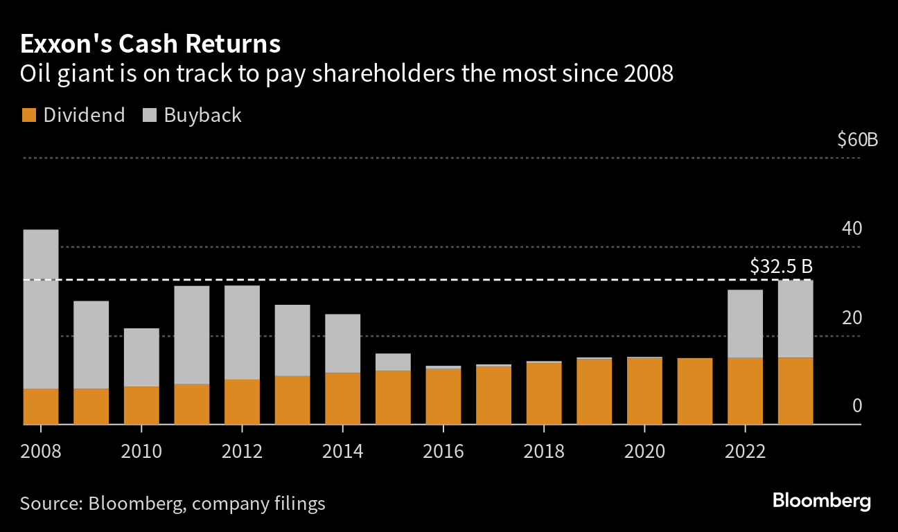 Adjusted earnings of $1.94 per share were 6 cents below the Bloomberg Consensus. Exxon pledged to continue buying back shares at a steady pace despite slipping cash flow and a recently announced $4.9 billion purchase of carbon-dioxide pipeline operator Denbury Inc.