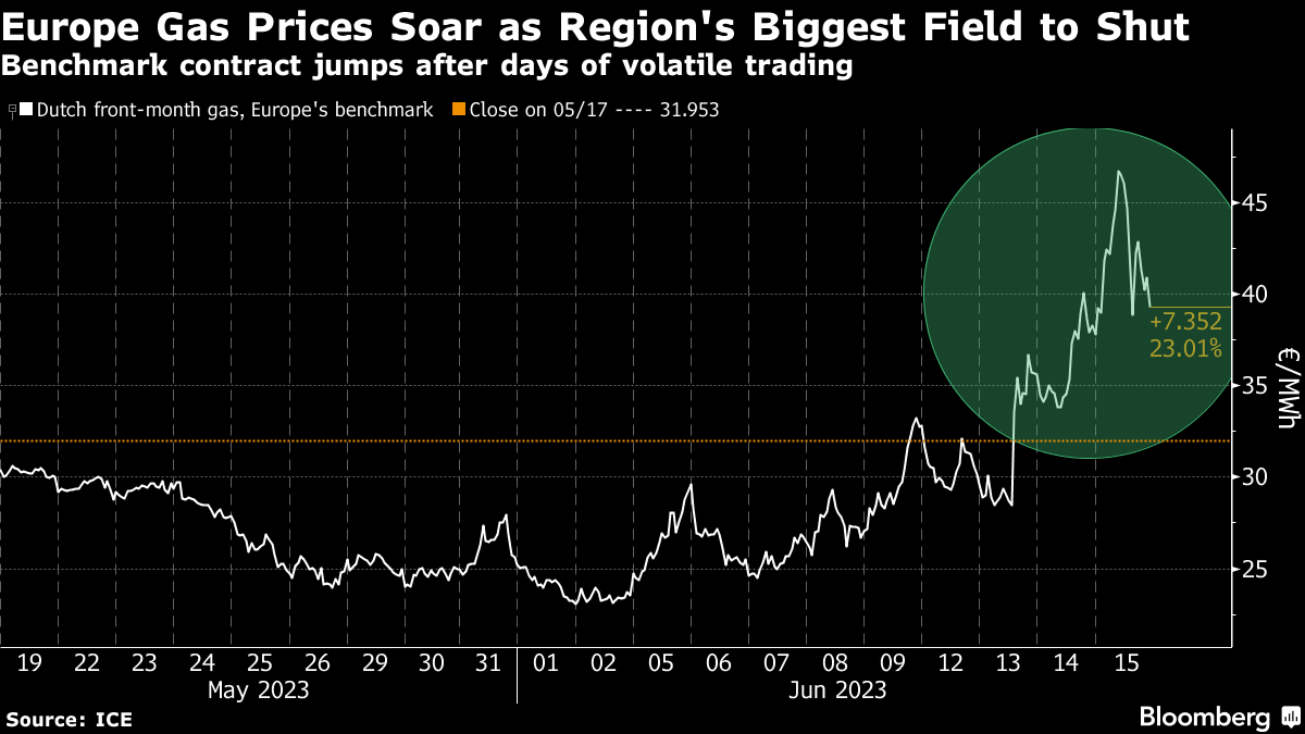 (Bloomberg) -- European gas prices rose in a day of extreme volatility, as the Netherlands prepared to permanently close a major field, outages tightened regional supplies and a heat wave boosted demand.