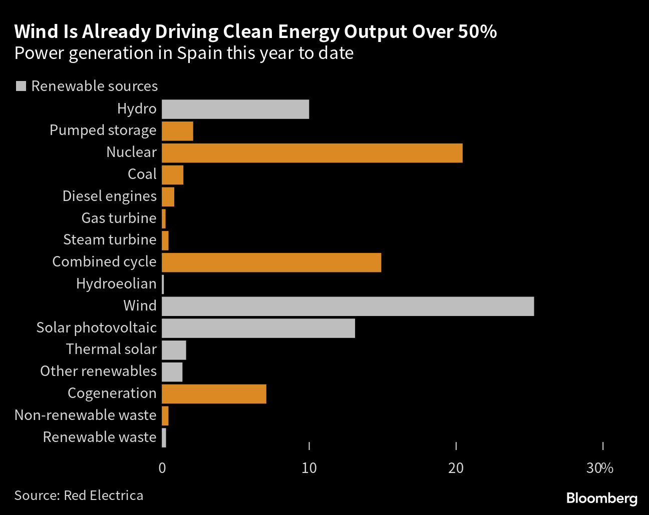(Bloomberg) -- Spain is on track to become the first country among Europe’s big five economies to generate more than 50% of its electricity from renewable sources, according to a forecast by Rystad Energy.