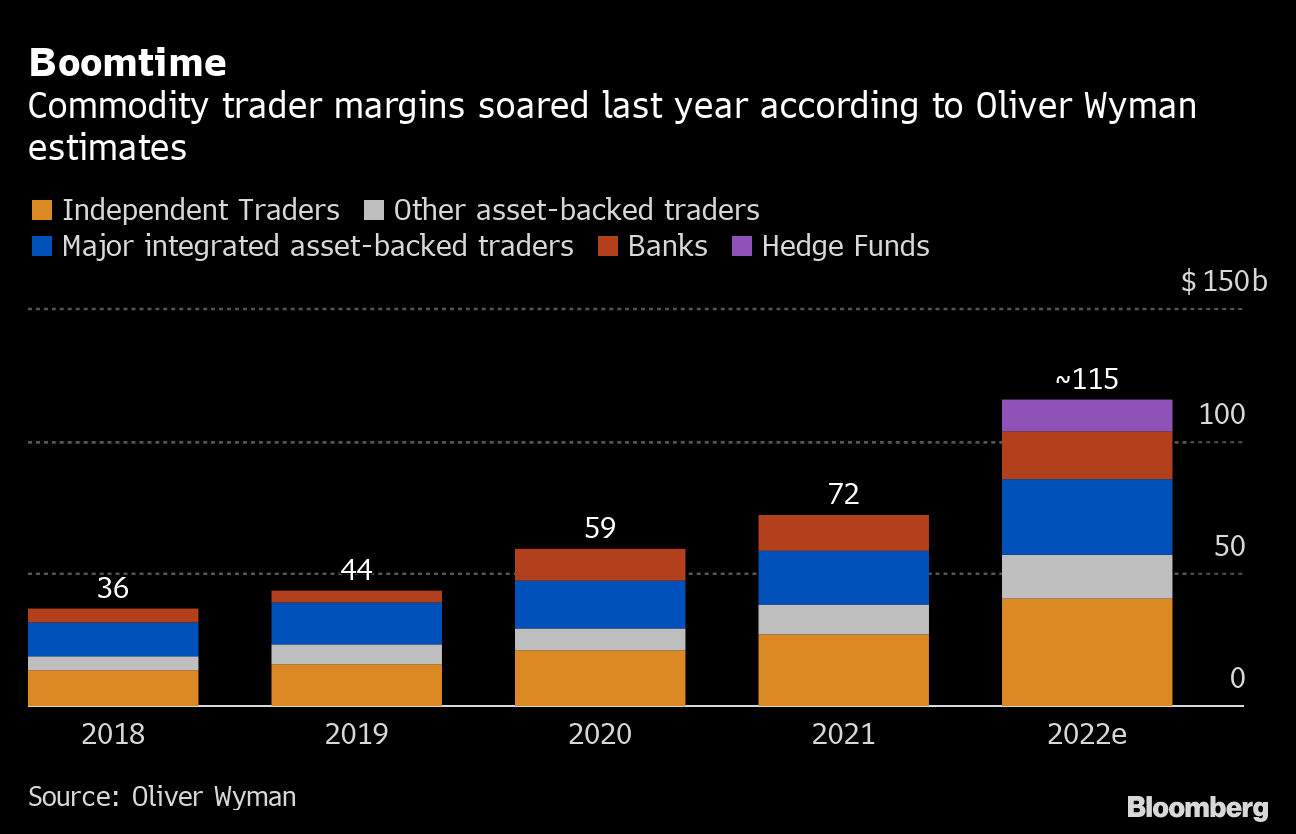 Industry gross margins have roughly tripled from $36 billion in 2018, with those of independent trading houses now far outstripping others in the sector, according to the report. The margins — the difference between the sales and purchase price of goods, minus direct costs such as financing and freight — are used by traders to assess their performance.